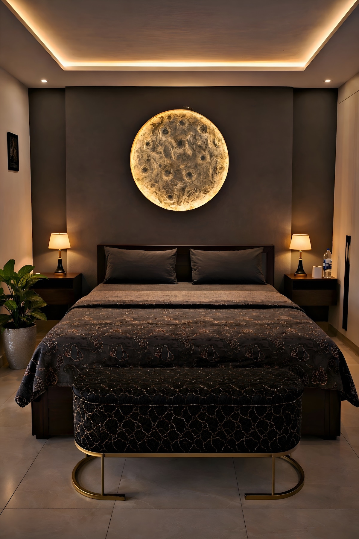 Our 1 BHK Orbit Penthouse in DHA Phase 5 is where urban chic meets celestial cool. Think: a glowing moon wall for those late-night selfies and a bold dollar-stacked art piece that screams "main character energy" Wake up to park views from your private balcony swing, binge your faves on the 50" 4K Smart TV, or cook up something aesthetic in the fully loaded designer kitchen. The interiors? Abstract, stylish, and made for the feed. Plus, you're right next to Lahore's hottest dining spots.