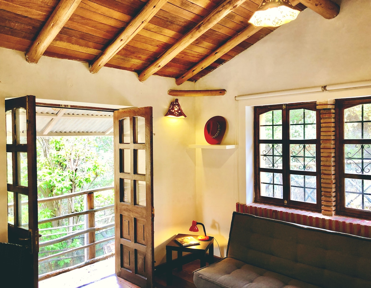 Calma & Calidez en nuestro Apartamento con luz natural, rústico con troncos de eucalipto, piso de madera,diseñado con muebles coloniales y belleza artesanal. Despierte con el canto de las aves en nuestra Habitación con SmartTv de 55' cable & Netflix Disfrute nuestro Balcón con cómodos sillones, vista a las montañas y al jardín acompañado de un café o un libro. Apartamento equipado con todo lo necesario para una comoda estadía,cocina abastecida con productos básicos Terrazas de piedra con Fogata