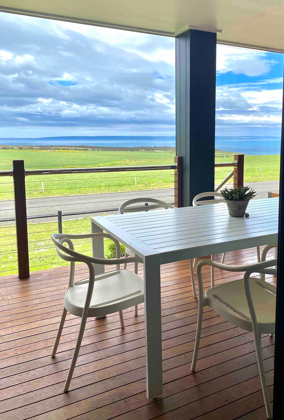 Una casa de playa de diseño arquitectónico con vistas a la hermosa bahía de Emu. Impresionantes vistas al mar desde todas las habitaciones. Ubicada en 5,5 acres de terreno privado. A 500 metros de la playa de Emu Bay. Aire acondicionado de ciclo inverso en todas partes. Chimenea de leña interior y exterior Generador de energía de respaldo Filtración de agua UV