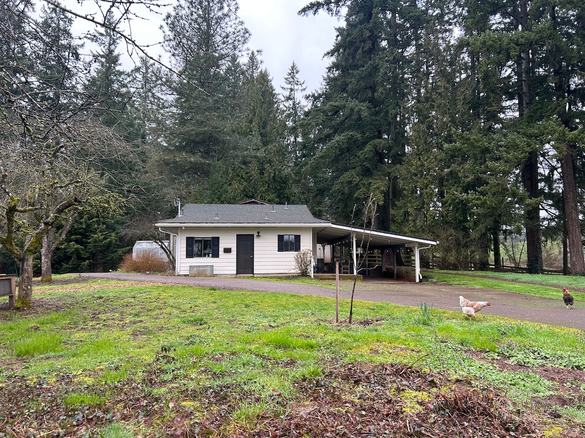 Esta encantadora casa de huéspedes está escondida en un entorno similar a un parque cerca de la entrada al Willamette Valley Wine Country. Este estudio muy espacioso ofrece un espacio cálido y acogedor con una cama tamaño king y una cómoda cama de día con una cama nido extraíble. También una sala de estar muy espaciosa con televisión para streaming ( Roku/Netflix instalado ) y chimenea. Disfruta de comidas ligeras o aperitivos en la cocina pequeña con nevera completa, microondas,tostadora, cafetera y todos los utensilios de cocina. Hermoso entorno exterior.