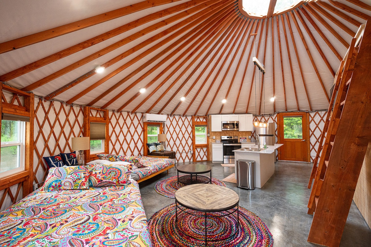¡YURTA de 30 pies con un loft y todos los lujos de un hogar (incluyendo CALEFACCIÓN y AIRE ACONDICIONADO)! Este espacio único está situado en nuestra granja de 50 acres con kilómetros de senderos y mucha privacidad. ¡Esta no es una tienda de campaña ordinaria! Esto es glamping en su máxima expresión con una cocina completa, fontanería regular, control del clima y todas las comodidades de un hogar. Ten en cuenta que lo anunciamos como 2 dormitorios, pero el segundo dormitorio es una zona loft abierta y no privada. ¡Te encantará tu estancia en la MEGA YURTA de Maggie!