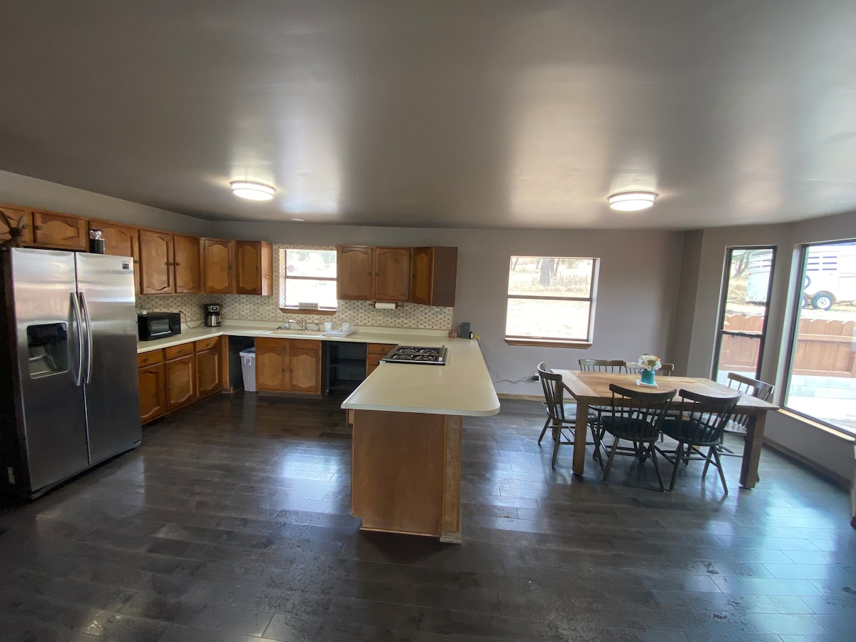 Fully remodeled open concept cabin. Features 3 private bedrooms, a large private bunk room that has a separate living area with 3 full size bunk beds, an open kitchen, family room area, and 3 full bathrooms . Outside you will find a beautiful covered wrap around deck featuring bbq grill, hot tub, and plenty of seating to enjoy breathtaking views. Accommodates 8-12 comfortably. The yard is zeroscaped including turfed areas for lawn games and an outdoor fire pit. NON-SMOKING cabin and no pets.