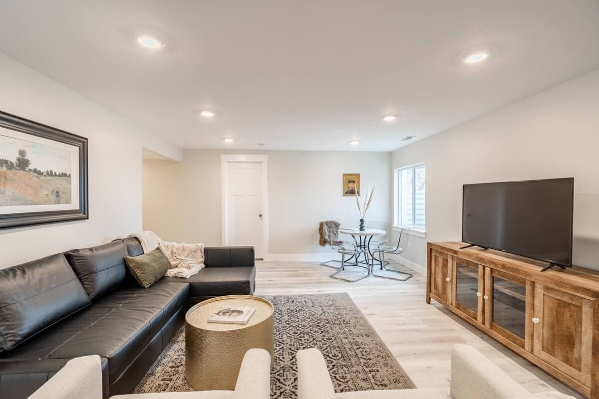 ¡Amplio sótano con TV de 65 pulgadas, cama tamaño king y jacuzzi!