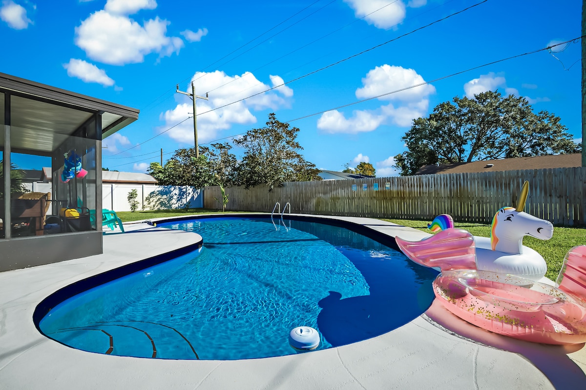 ¡Nuestra impresionante casa de ensueño luminosa y brillante con piscina te espera! Esta cocina actualizada cuenta con electrodomésticos de acero inoxidable mejorados, muebles nuevos y suelos nuevos. ¡Ideal para familias! Incluye un patio trasero vallado privado con piscina y zona de patio al aire libre. A 3 minutos de tiendas y restaurantes. A menos de 20 millas del complejo USSSA Space Coast. A solo 6,2 millas de la playa y a 6,1 millas del centro de Melbourne. Pueden dormir hasta 10 personas. ¡Te enamorarás de este hermoso lugar!