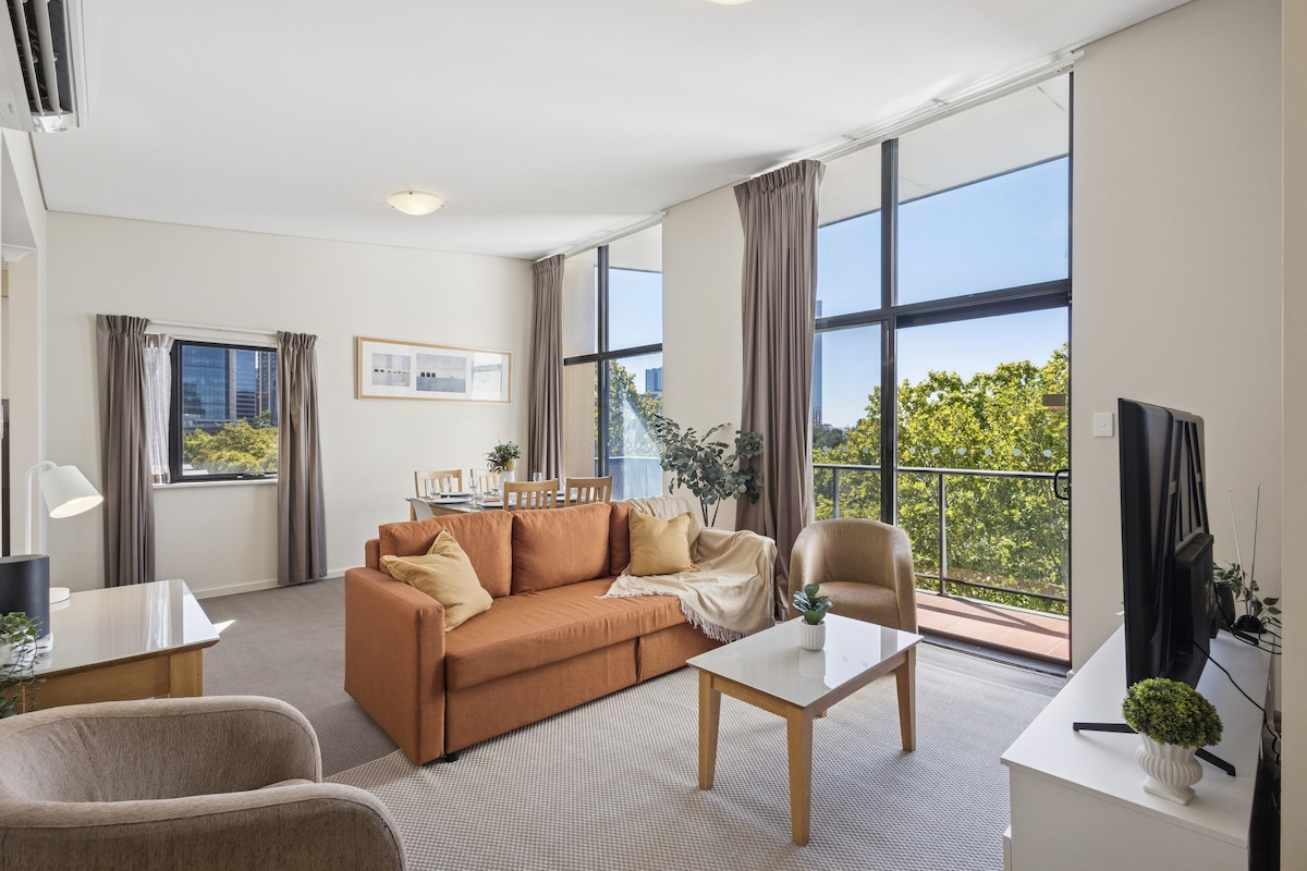 Relax in this bright, top-floor CBD apartment with city skyline views and resort-style pool, gym & tennis court. ✔ Queen master bedroom ✔ Flexible second bedroom (2 singles or 1 king) ✔ Queen sofa bed ✔ Private balcony with city views ✔ Fully equipped kitchen with Nespresso coffee machine ✔ Smart TV & free WiFi ✔ Free parking ✔ Pool, gym & tennis court ✔ Highchair & travel cot Enjoy city living just minutes from Elizabeth Quay, Swan River, Kings Park, Perth Convention Centre & Mount Hospital.