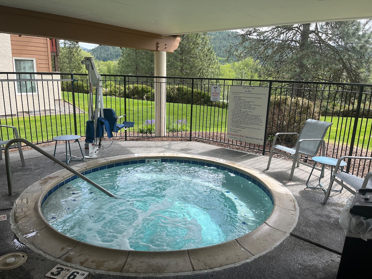 Ven y disfruta de cualquier estación en Leavenworth Te sentirás como en casa tan pronto como entres en nuestro espacioso, limpio y moderno apartamento con vistas al hoyo 14 del campo de golf. Disfruta de 2 piscinas + piscina para niños pequeños (las piscinas están abiertas dependiendo del clima invernal), 3 jacuzzis están abiertos para uso de los huéspedes, vistas y un fácil paseo hasta el pueblo de Leavenworth para pasear, ir de compras y cenar. La ventaja es poder aparcar en la cochera y caminar hasta la calle principal, ya que aparcar puede ser un desafío en los días más concurridos.