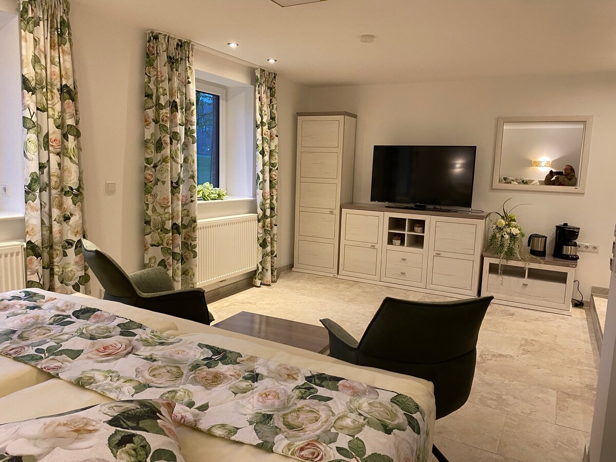 ¡Es hora de sorprender a tu ser querido con ZEIT ZU ZWEIT! Este elegante apartamento, amueblado con atención al detalle, no deja nada que desear. Se ha pensado en todo aquí. ¡Ya sea para un cumpleaños, Navidad, aniversario o simplemente porque sí! Regala tiempo de calidad en este apartamento romántico con bañera XXL (8 chorros de piso) y chimenea. Sauna y piscina en la primera planta, para uso común, completan su breve descanso. IG: zeitzuzweit.honeymoonsuite