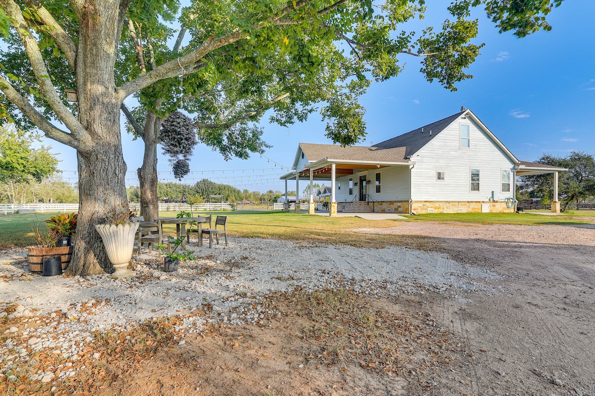 Family Yard Games | Outdoor Kitchen Sunsets burn gold and stars sparkle bright at 'Rancho Emperador', a Needville escape set on 30 acres of peaceful Texas countryside. This 3-bedroom, 3-bath vacation rental retreat pairs rustic warmth with modern comfort, creating a welcoming base for family and friends. Gather fresh eggs from the chicken coop for a farm-style breakfast, explore the scenic trails of Brazos Bend State Park, and wind down around the crackling fire pit!