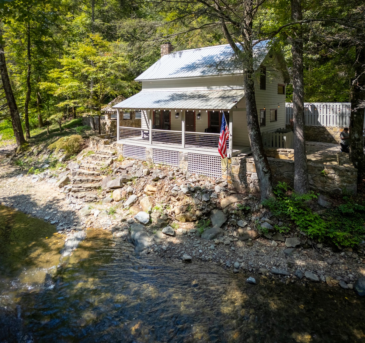 Esta es una casa de campo de 1570 pies cuadrados con terraza, ubicada en una granja privada de caballos en el histórico valle de Sautee, en el norte de Georgia. ¡Disfruta de la cocina completa con una isla de granja hecha a mano, un rincón de lectura y una acogedora sala de estar con chimenea personalizada! El dormitorio principal grande cuenta con una preciosa cama antigua de cuatro postes tamaño king. ¡El baño grande es para morirse! ¡Ultraromántico! Jacuzzi en un porche privado con cortinas. Ofrecemos una experiencia privada de equitación, que se reserva por separado.