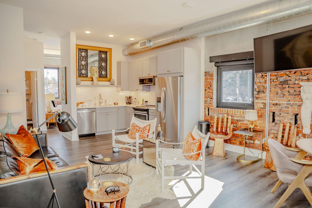 La suite crème de le crème en el hermoso hotel boutique, The Hive. No se escatimaron detalles en esta lujosa suite con paredes de ladrillo visto originales, techos altos de 12 pies, una cocina moderna con hermosas encimeras de cuarzo y electrodomésticos de acero inoxidable y una mesa de comedor para 4-6. ¡La acogedora sala de estar tiene grandes ventanales, un sofá cama de cuero con colchón de espuma viscoelástica y arte original en todas partes! Desde la gran ducha a ras de suelo hasta las sábanas y toallas de lujo, y