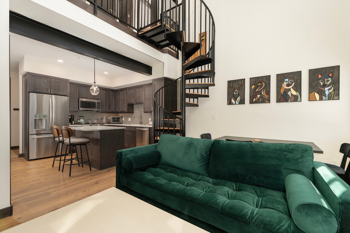 El alquiler vacacional contemporáneo se encuentra en la base de la estación de esquí del parque de invierno. Premier de un dormitorio con cama King. Capacidad para 4 personas. En el tercer piso con acceso a barbacoa, bañera de hidromasaje NUEVA y chimenea. Disfruta de una cocina eficiente con electrodomésticos de acero inoxidable. Auto registro de entrada. Licencia #005596
