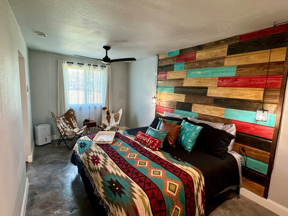 Escápate a Walnut Creek Retreat, una casa de huéspedes rústica y elegante situada en nuestras 7,5 hectáreas privadas entre Boyd y Decatur. Renovado cuidadosamente con encanto vintage y joyas de segunda mano, ofrece una comodidad acogedora y cuidada justo detrás de nuestra casa principal. Tómate un café en el porche, respira el aire fresco del campo y desconecta. Tanto si busca descansar como si asiste a eventos de NRS, este tranquilo refugio es el lugar perfecto para relajarse y recargar energías. La vida en el campo puede traer insectos, ratones o escorpiones cerca.
