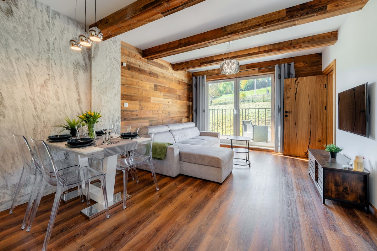 Apartamento íntimo, funcional y acogedor con baño para un máximo de 4 personas, decorado con un toque montañés, equipado con TV y WIFI con vistas a las montañas. El salón está equipado, entre otros, con un sofá cama para 2 personas y una cocina totalmente equipada con nevera. Dormitorio para 2 personas, baño con ducha. Con vistas a las montañas.