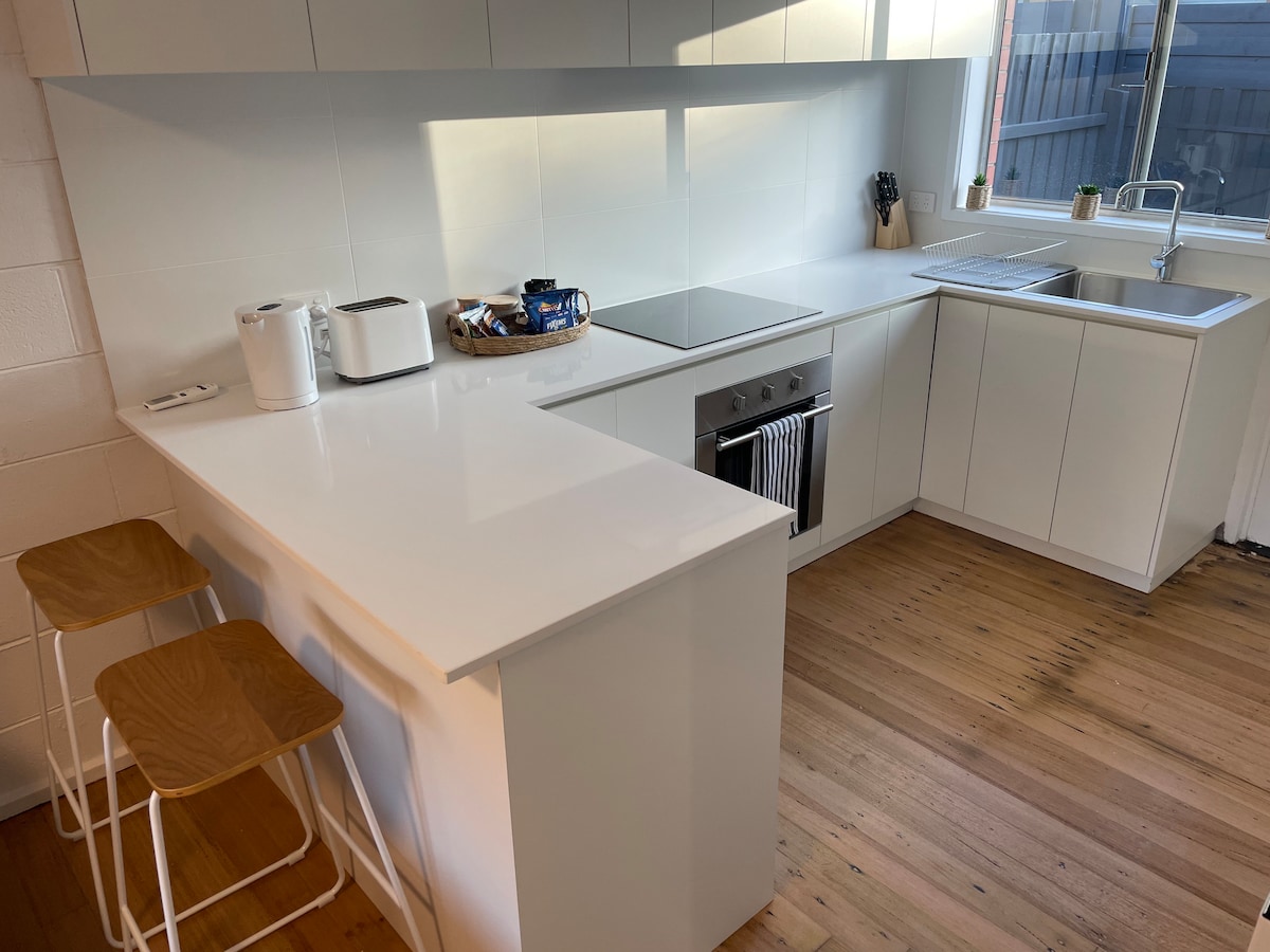 La estación de tren con una línea directa a Melbourne CBD está a 1 minuto a pie, al igual que las cafeterías y tiendas. Esta unidad está completamente contenida y amueblada para tu comodidad. Calefacción/refrigeración Capacidad para 5 personas 1 cama tamaño queen en el dormitorio principal. Litera en el segundo dormitorio (doble en la parte inferior y individual de arriba) Sofá para 3 personas y TV inteligente. Toallas y ropa de cama frescas La cocina está totalmente equipada Asegura la puerta de control remoto para entrar en el bloque de 4 unidades te proporciona seguridad y tranquilidad.