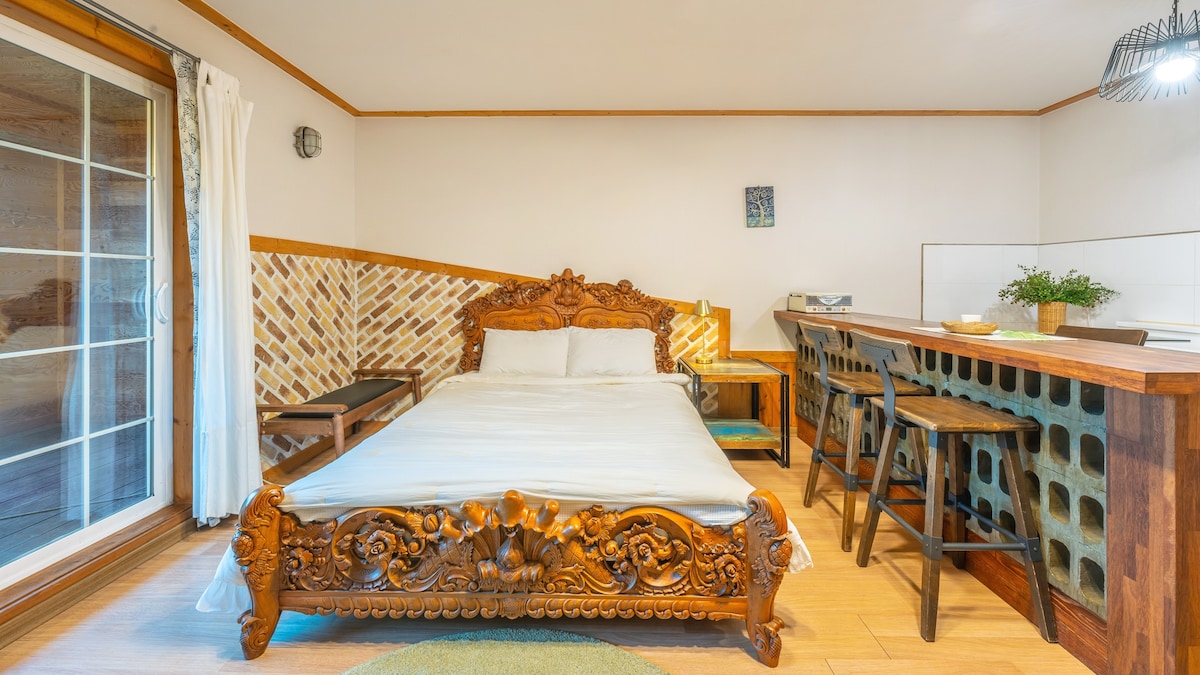 Este espacio especial incluye una casa privada y un espacio al aire libre muy espacioso. Todos los espacios están abiertos solo mientras estés aquí mientras estés aquí. Disfruta del fuego por la noche mientras observas las estrellas y la luna. Hasta el amanecer, puedes disfrutar del ambiente relajante del espacio y la música con luces LED. Cuando llueve, mirando el valle, la barbacoa en el bungalow es otra felicidad. Hay un parque infantil y un sendero, así que no te pierdas ningún ejercicio, como senderos y bares de bádminton. Después de las rutas de senderismo de Yongmunsan y Jungwon Mountain, sumérgete y disfruta sanando en el valle cristalino junto a la pensión. La sala con vistas a Vally es una habitación donde puedes tumbarte en la cama y contemplar el valle. La habitación con vistas al jardín es una habitación donde se puede ver el espacio más grande y el jardín privado y el parque infantil juntos. En función del número de personas, solo se puede utilizar una de las dos habitaciones independientes. Por una tarifa adicional, ambas habitaciones se pueden utilizar solas. Relación en la naturaleza # Valley # Fiesta privada # Barbacoa # Fung # Perro