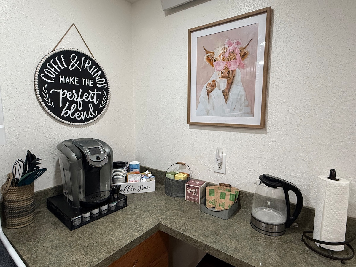 Los sueños son bienvenidos mientras te mimas en la suite más romántica de Laramie. Con su propia entrada privada, se puede alquilar sola o con la casa de campo adjunta (consulta el anuncio «Storybook Garden Cottage»). El armario antiguo ha sido equipado con platos, vasos, tazas, cubiertos, microondas y tostadora. Keurig con café y accesorios incluidos. Mininevera retro con congelador separado. Una plaza de aparcamiento.