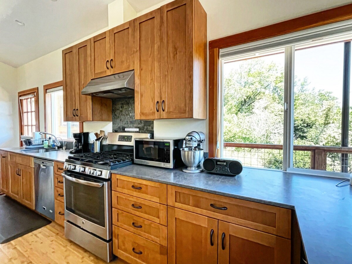Enjoy the perched feeling of Sonoma Mountain's setting with sweeping views and nature. The slightly tamed wilderness with an olive grove, gardens and trails sets the tone as you chill on the redwood deck. This is a studio cottage with expansive views to the western valley and Marin. Mount Tam appears through the windows. This is a beautiful unique space adjacent to a mellow artist's studio. Security gate to enter this working ranch. Well behaved and Pre-Approved dogs available for a nightly fee.