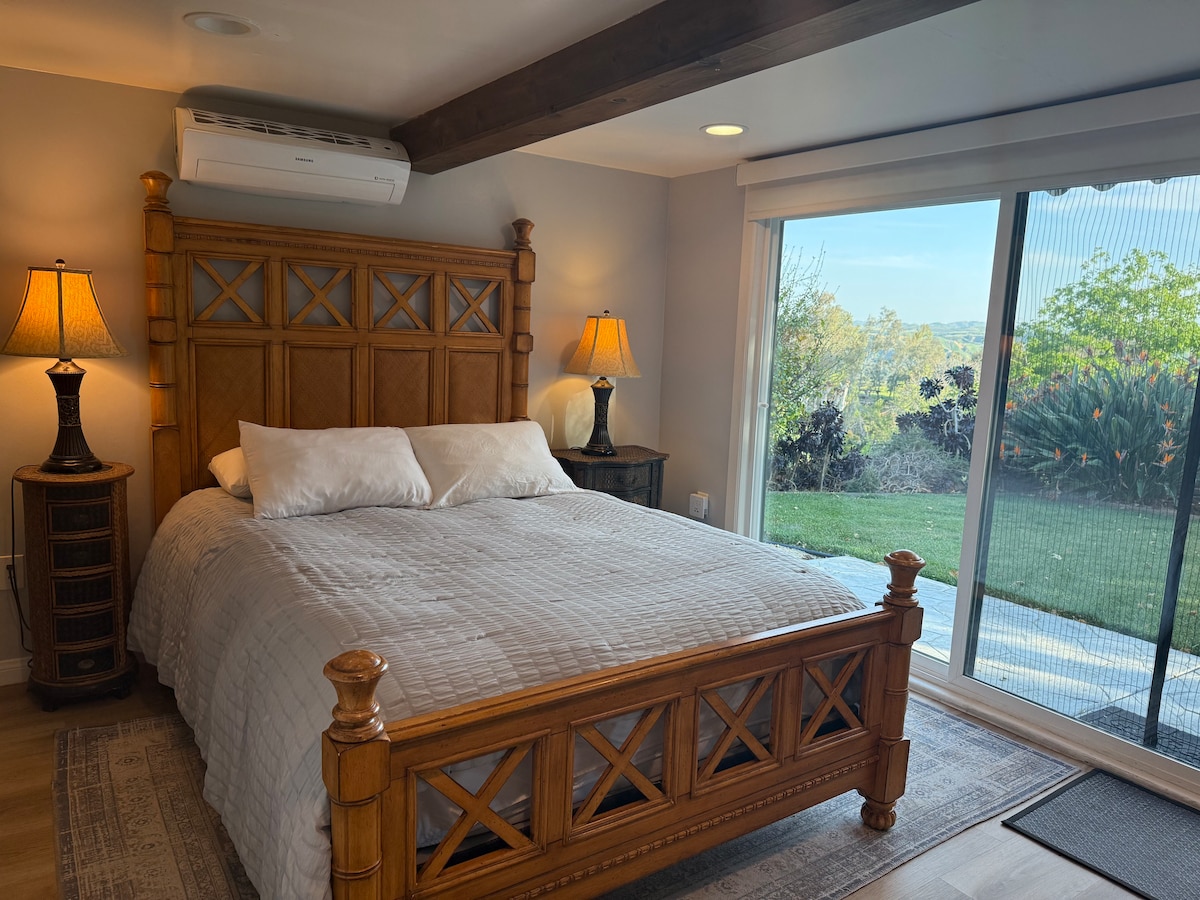 Acogedora y confortable suite principal con entrada privada. Las nuevas puertas francesas se abren a un dormitorio privado con un baño recién remodelado, una pequeña cocina, 2 armarios grandes y una pintoresca zona al aire libre que amplía la sala de estar. Televisor inteligente montado en la pared y ventilador de techo para mantener frescos a los huéspedes. Propiedad ubicada en Upper Yucaipa a solo 5 minutos del centro de Yucaipa, YPAC, restaurantes, el parque regional y a 10 minutos de Oak Glen Preserve, a 15 minutos de Historic Redlands.