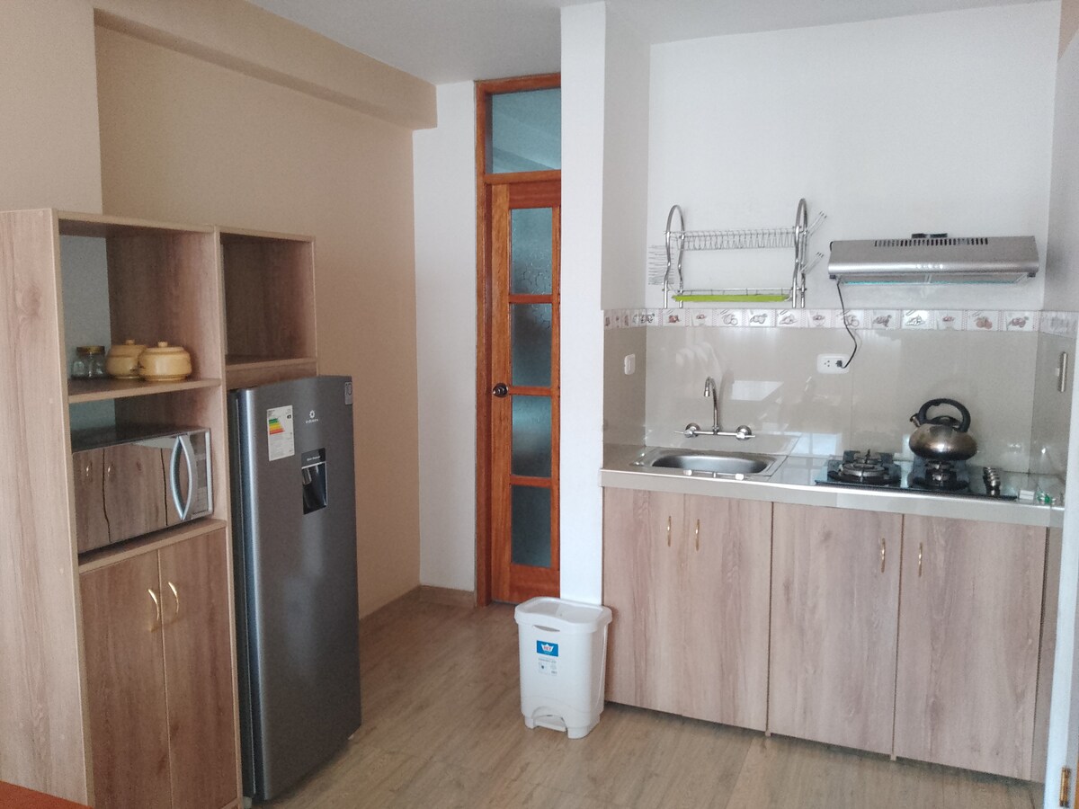 Edificio de 4 pisos, en el tercer piso un minidepartamento con 1 habitación, sala, comedor, cocineta y baño. Tiene agua caliente en todos los servicios ( lavatorio, ducha, cocina) tv cable y wifi. A 8 minutos de la provincia de urubamba. Yucay un lugar súper tranquilo, con muchas areas verdes al alrededor, a solo 30 minutos de los centros turisticos en el valle sagrado. Movilidad a toda hora y especialmente a 35 minutos a la estacion de ollantaytambo para abordar el tren y visitar machupicchu .