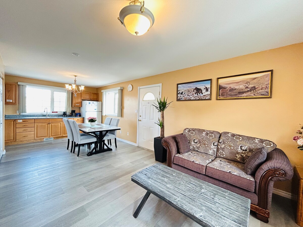 Suite luminosa y espaciosa de 1 dormitorio en el codiciado barrio de Porter Creek, ¡tu acogedora base en Whitehorse! Esta suite en el sótano de nueva construcción cuenta con un televisor inteligente de 50", wifi rápido, cocina completa y lavandería en la suite para tu comodidad. A solo 8 minutos del centro de la ciudad y a poca distancia a pie de Smoke & Sow BBQ, un pub local, una tienda de comestibles y transporte público. Perfecto para parejas, aventureros solitarios o viajeros de negocios que buscan comodidad, estilo y una excelente ubicación.