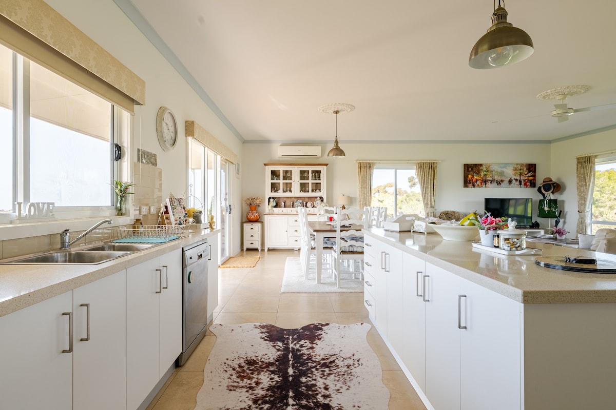 Ubicada en 50 acres de tierras de cultivo, esta propiedad única cuenta con 2 grandes lagos con botes de remos, kayaks y hermosos jardines, abundancia de vida silvestre y un ambiente sereno y tranquilo. Tus anfitriones, Ann y Kevin, viven en la casa principal, a unos 100 metros de la casa de campo junto al lago y están disponibles si es necesario, o pueden ser muy discretos. Tienes acceso gratuito a toda la propiedad, con hermosos paseos y animales de granja con los que interactuar. La propiedad está a 5 minutos de Hanging Rock y a 15 minutos de Kyneton y Woodend.