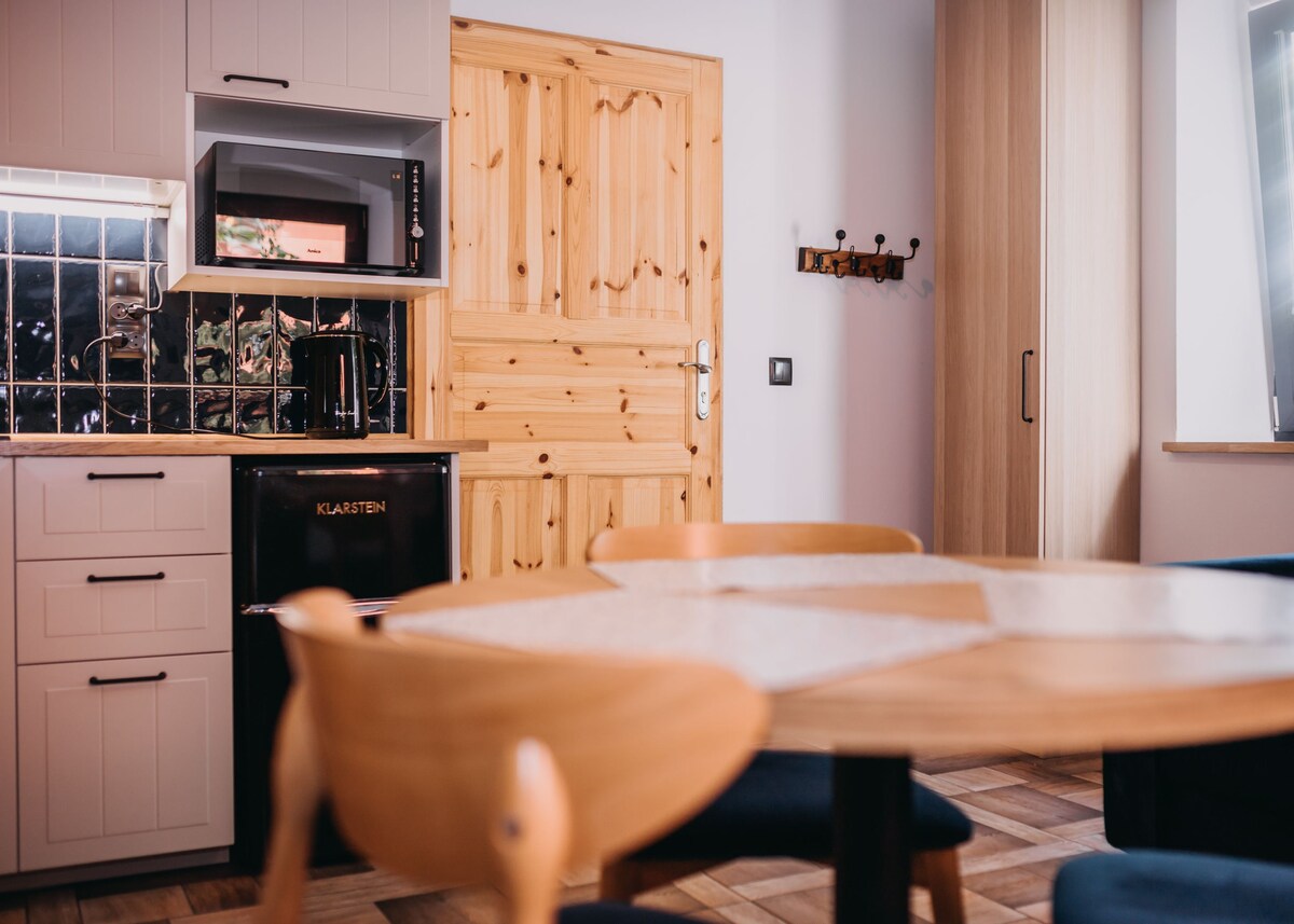 Apartament z osobnym pokojem TV z sofą dla dwojga jest klimatycznym wnętrzem, starego, wyremontowanego domu z 1900 r. Dwupoziomowy apartament zajmuje wschodnią część pierwszego piętra budynku oraz poddasze, na którym znajduje się antresola dla czterech osób. Apartament wyposażony jest w aneks kuchenny połączony z salonem, łazienkę, TV z Netflix i przeglądarką, cały budynek obejmuje darmowe Wi-Fi. Budynek usytuowany jest w spokojnej okolicy Gór Sowich, posiada ogród z miejscem na grill i parking