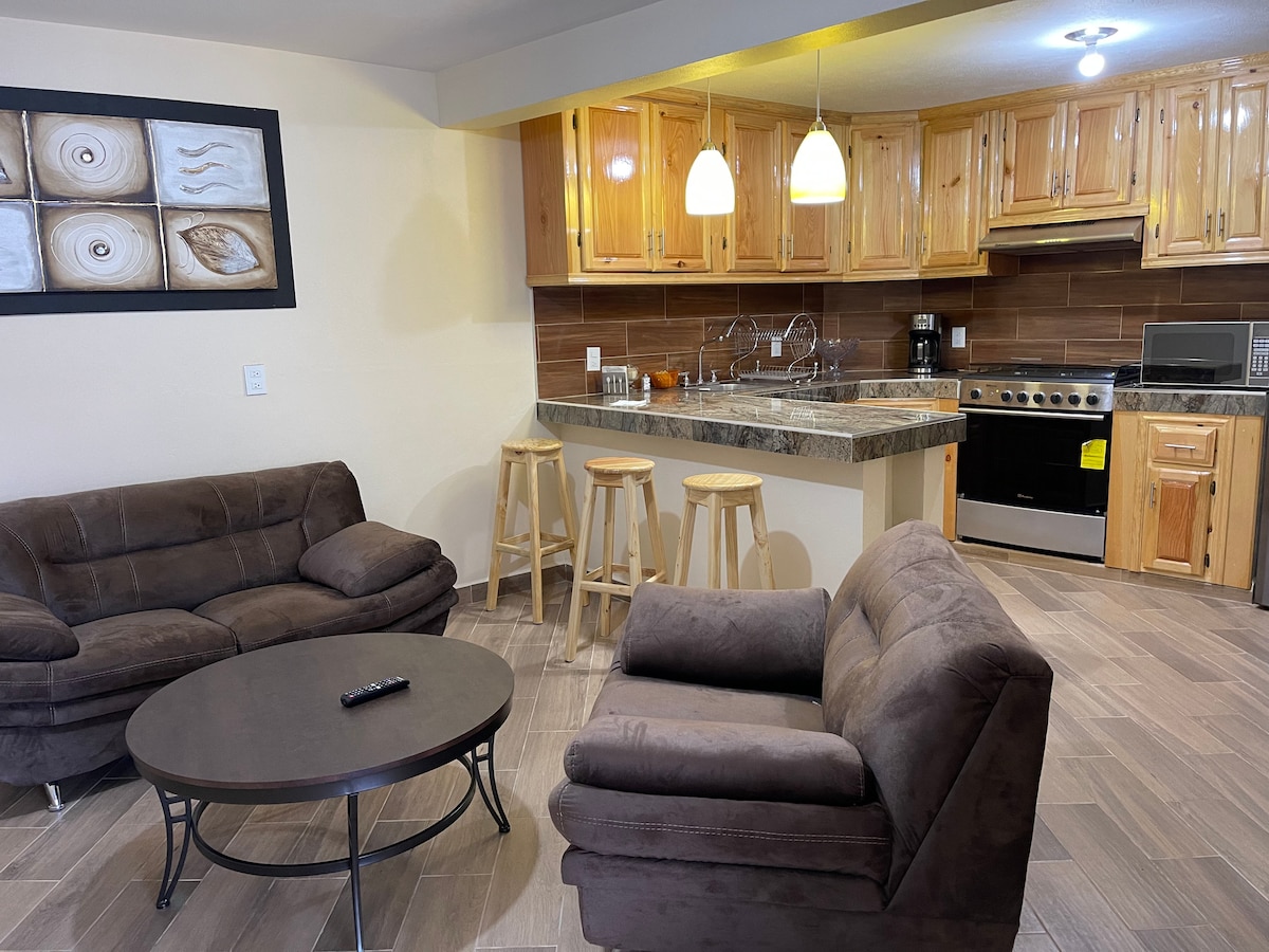 Desconectate de tus preocupaciones en este espacio amplio y sereno. -Cuenta con cama Queen size. -Sofá cama. -Comedor. -Barra desayunador. -Cocina completa. -Lugar de estacionamiento para un coche. A menos de 10 minutos del centro en auto.