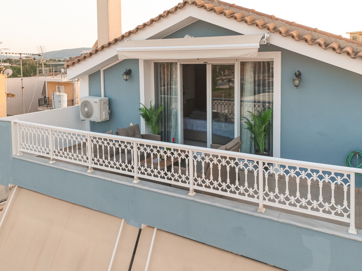 Un pequeño apartamento ático en el centro de la ciudad de Zante. La experiencia de caminar por toda la ciudad en unas horas, elegir cenar en nuestros restaurantes locales en la calle pavimentada, te hará entender la hospitalidad de los lugareños y calentar tus corazones. Tiendas, comida, helados, museos, cine, bares, ¡a menos de un minuto de ti! No olvides que la ciudad tiene 2 playas famosas para refrescarte.