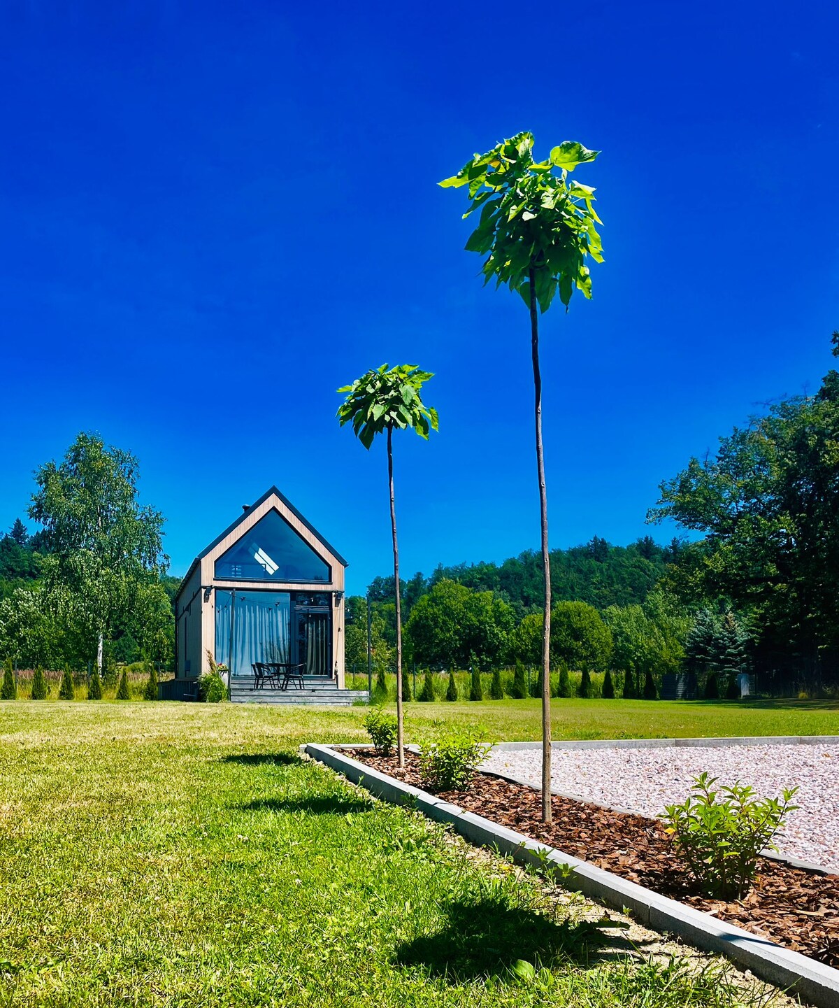 Drugi z naszych domków w Komarnie, z widokiem na góry i dostępem do ogrodu. Idealny na spokojny wypoczynek w naturze. W pełni wyposażony, z aneksem kuchennym i tarasem. Możliwość rezerwacji obu domków – świetna opcja dla rodzin i grup. Blisko szlaków, atrakcji Dolnego Śląska i pięknych krajobrazów.