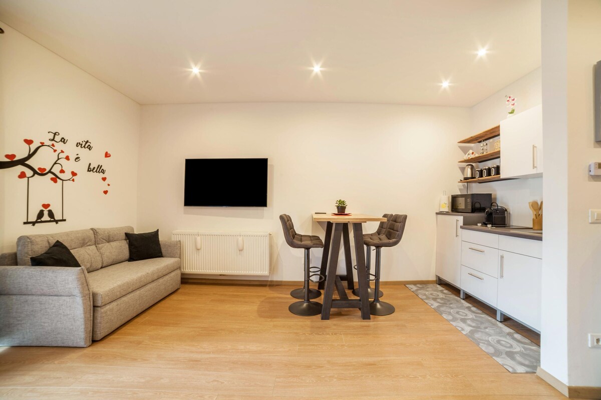 Este elegante apartamento de 2 habitaciones (57 m²) ha sido completamente renovado y ofrece todo lo que necesitas para tus vacaciones en el centro de Merano. En la zona de entrada, hay un armario abierto y un banco. El baño cuenta con una gran ducha y un inodoro con bidé. En la sala de estar, hay una cocina con servicios esenciales, un comedor y un gran sofá cama (180x 200 cm). En el dormitorio, hay una cama doble grande (180x 200 cm) y un armario abierto.