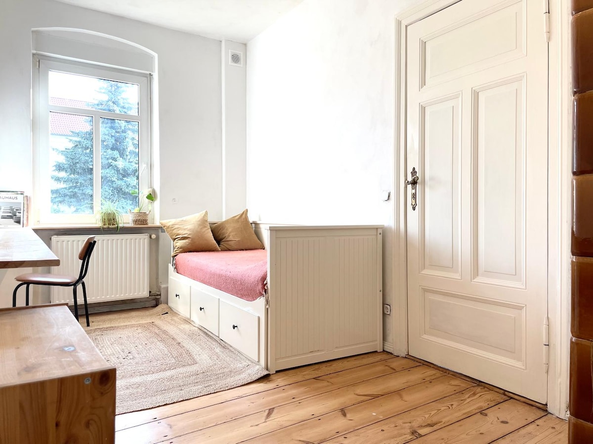 Ich vermiete dieses Zimmer meines Hauses in ruhiger Lage mit Schlafplätzen für jeweils eine Einzelperson oder ein Paar. Das Sofabett ist 140 cm breit. Küche und Bad nutzen wir gemeinsam. Mein Haus ist in etwa 15 Minuten Fußweg vom S-Bahnhof Zeuthen entfernt. Von dort aus kommt man mit der Bahn in etwa 40 Minuten ins Stadtzentrum von Berlin.